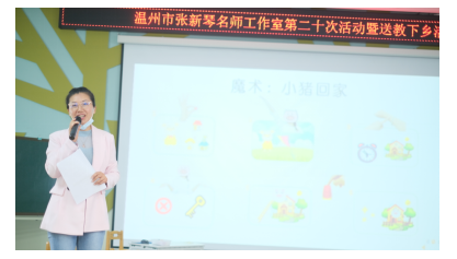 乐清市骨干教师、乐清市优秀教师万婉倩老师为大家带来大班语言《小猪回家》。《幼儿园教育指导纲要(试行)》指出:“游戏是幼儿园教育的基本活动。”万老师始终让游戏精神贯穿整个活动当中,借助“小猪回家”的魔法游戏,充分调动孩子们活跃的思维,让幼儿带着愉快的心境主动学习和发展,有效提升语言表达及社会交往能力。