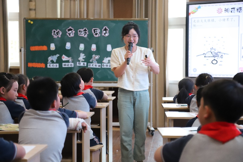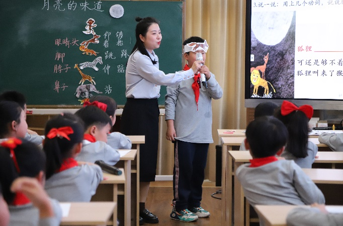 第二节是由温州蒲州育英学校的张冰茹老师和一(2)班的学生带来的创意读写课《月亮的味道》。张老师带领学生认真倾听故事内容,仔细观察故事画面中动物们的动作,说一说,演一演,感受到故事内容的有趣,体会小动物们齐心协力吃到月亮的团结精神。