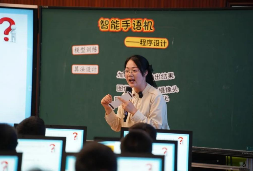 活动首先进行了两节精彩的人工智能课程展示。平阳县昆阳镇第二小学的许凤双老师以《AI智能手语机》为主题,从成品展示入手,引导学生发现问题,并思考如何训练模型、识别过程和算法流程图。学生通过结合程序进行实践,最终检验成果,实现了人工智能手语机的功能。