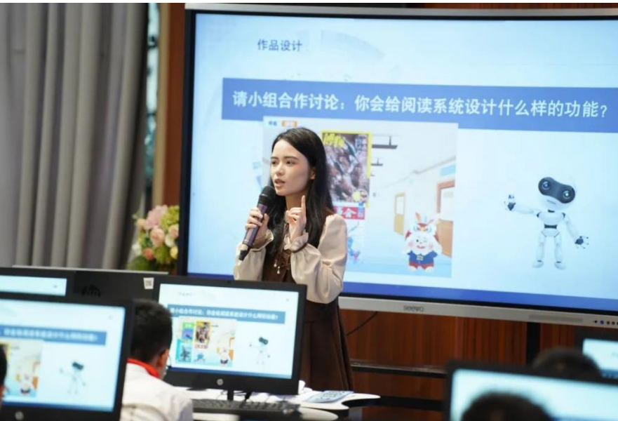 平阳县昆阳镇新城小学的郑唐怡轩老师则展示了《智感阅读系统》课程。她以情境导入的方式,引导学生设计智感阅读系统的功能,并提炼选中阅读、上一页下一页等功能进行程序实践。学生通过训练多个模型,并在不同角色上编写相应功能,最终实现了智感阅读系统的功能。课堂最后,郑老师还拓展了更多功能演示,并鼓励学生坚持设计并实践落地。