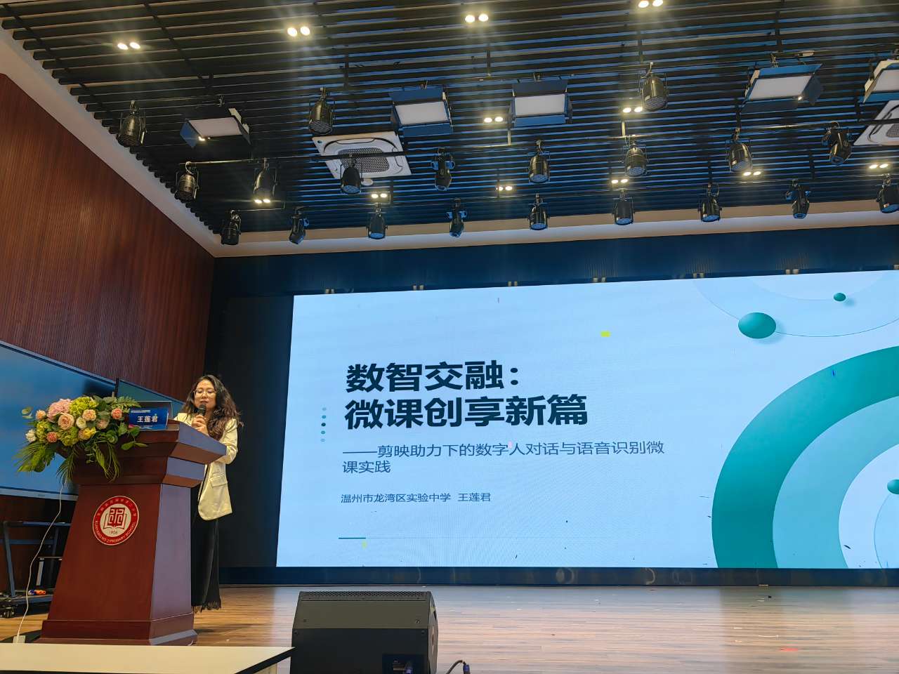温州市龙湾区实验中学的王莲君分享《数智交融:微课创享新篇——剪映助力下的数字人对话与语音识别微课实践》,王老师先展示她的无人机飞行微课的实践成果,令人眼前一亮,并介绍她在微课制作过程中所使用的数字人技术、文生图/图生视频技术、剪映抠图与识别字幕功能等,为大家对比分享了多种技术与平台,足见准备之精心。王老师还认为微课创新应是内容、形式、技术等多方面的创新下一步她将继续探索技术融合创新和跨界合作拓展,使微课创新更上一个台阶。