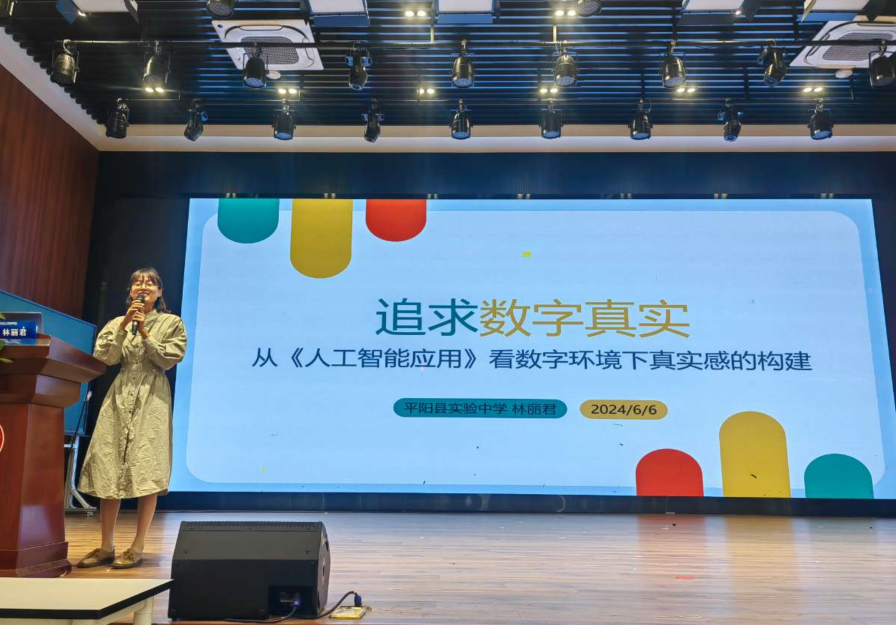 平阳县实验中学的林丽君老师分享《追求数字真实:从人工智能应用看数字环境下真实感的构建》,林老师从一线教师的角度结合自己的困惑出发,为大家介绍了如何在虚拟的数字课程中设计活动增加真实感,如思考问题增加互动,实验教学增加体验等,林老师还总结出为实现真实感可以在数字课程中体现氛围感、幽默感、亲切感、体验感、获得感以及互动感和科技感。