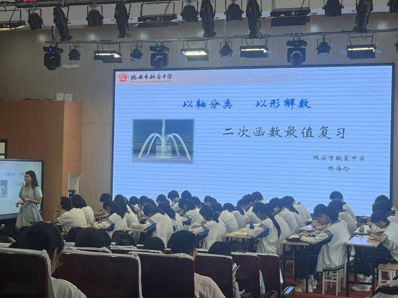 2025年5月21日下午,首先是瑞安市毓蒙中学的林海伦老师带来一堂精彩的公开课——《以轴分类 以形解数 ——二次函数最值复习》。林老师以二次函数图象为切入点,引导学生从图象中获取关键信息并求解解析式。随后,通过设定不同范围,逐步引导学生求解最大值和最小值,并归纳出解题的思考步骤。课堂上,林老师巧妙地从“定轴定区间”过渡到“定轴动区间”,再到“动轴定区间”,层层递进,激发学生的深度思考,使学生在动态变化中掌握二次函数最值问题的解题策略。