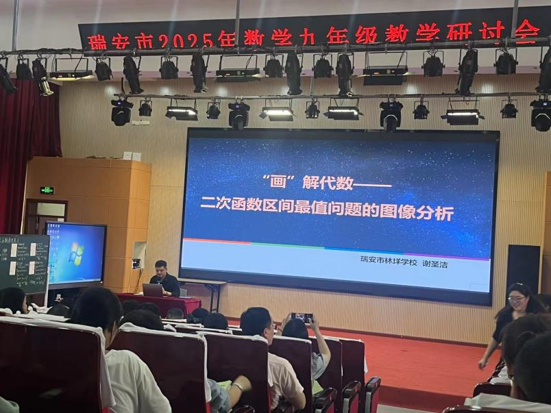 紧接着,瑞安市林垟学校的谢圣洁老师带来专题讲座《画解代数——二次函数区间最值问题的图象分析》的精彩发言。谢老师从两版二次函数的课标要求对比入手,强调教学中要研通性通法。他提出,教学设计应注重“精架构”,以新课标为起点,突出知识的纵向衔接与横向关联,强化整体性与工具性;同时,要注重“精渗透”,在课堂上通过精准提问、精准干预、精准提炼和精美制作,引导学生发展多元性思维、阶梯性思维和可视化思维。谢老师的发言为在场教师提供了新的教学思路与方法,引发了大家对数学教学的深入思考。