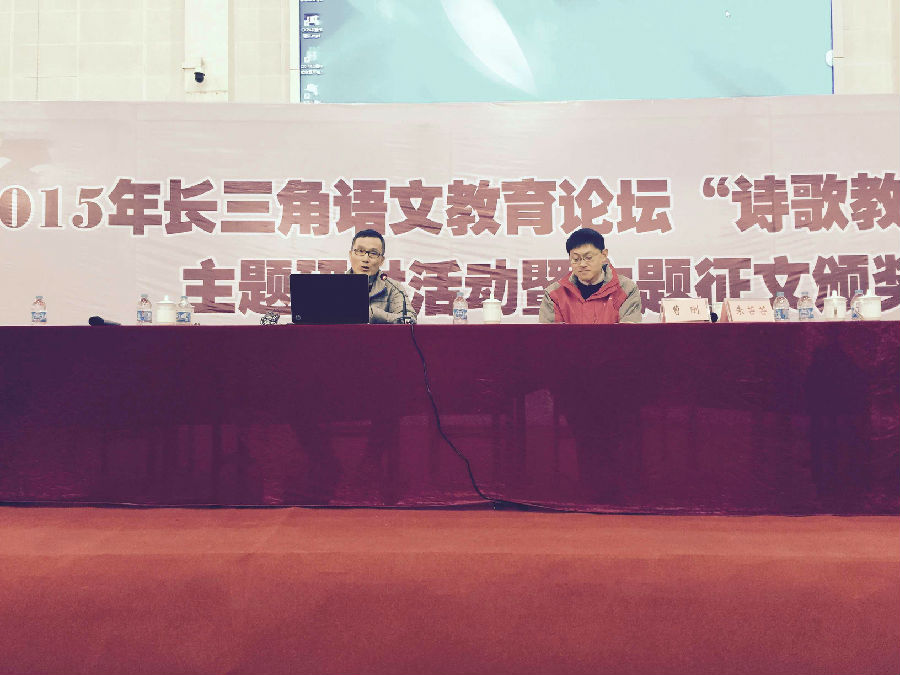 29日上午,金戈老师受大会邀请,作为浙江省教研员的代表,对初中语文一组的三首诗的教学进行了评析。金老师评析《乡愁》时提出,诗是形式与内容的统一,教学应注重对凝重情感的把握;评析《在哈尔盖仰望星空》时提出,现代诗最重要的不是诗告诉我们什么,而是诗人有什么感觉,要抓住诗歌的灵魂;评析《破阵子》时则提出,一首古诗就是一个整体的生命,要注重形式、节奏感和音韵。金戈老师的点评受到了与会老师的一致好评,闭幕式上江苏省语文教研员朱芒芒多次引用金戈老师的发言作大会总结陈辞。