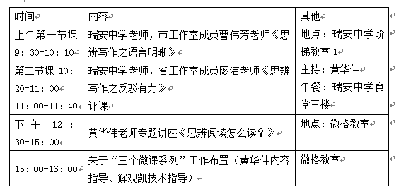 根据工作室工作计划,特举行“思辨性阅读与表达”专题研讨会,请省、市两级工作室成员安排好工作,准时参加活动,其中省级工作室成员中非温州区域的,可以不参加这次活动。