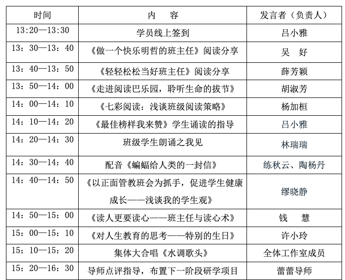 为贯彻《教育部关于进一步加强中小学班主任工作的意见》文件精神,发挥名师示范辐射作用,加快班主任队伍建设,提高工作室学员的综合素养及班主任智慧管理能力,促进工作室成员的专业发展,特举行黄笑蕾名班主任工作室总第三十三次集训活动。