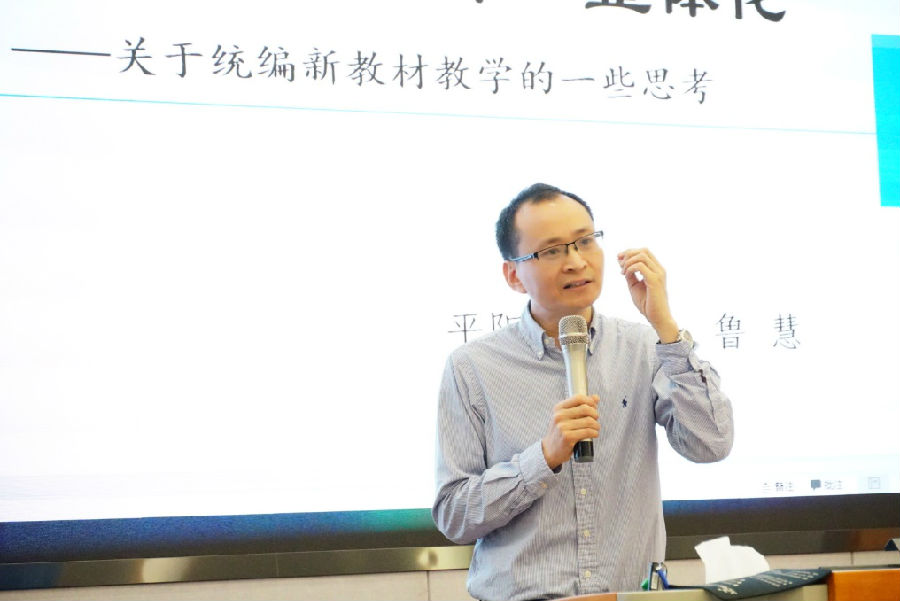 活动第三项内容为主题讲座。来自平阳中学的鲁慧老师依据高中思想政治课程的课程性质向参会老师作了《活动型 学科味 整体化——关于统编新教材教学的一些思考》主题讲座。鲁老师从活动型、学科味、整体化三个分享了她的思考与收获。从“搞什么活动”、“怎样搞活动”、“为什么活动”三块内容来着重讲解如何将活动融入课堂实践;从“政治性与学理性相统一”、“价值性与知识性相统一”两个角度指出要让活动有思政学科的味道;以“统整教材”、“统整教法”、“统整知行”三个关键词来强调课程教学要凸显学科的精神气质、训练学科的思维能力、促成学生的全面发展。鲁老师的分享内容丰富,她向参会老师展示了优秀课例,并提供了切实可行的指导意见,让参会老师对活动型学科课程有了更加深刻的感悟与体会,收获良多。
