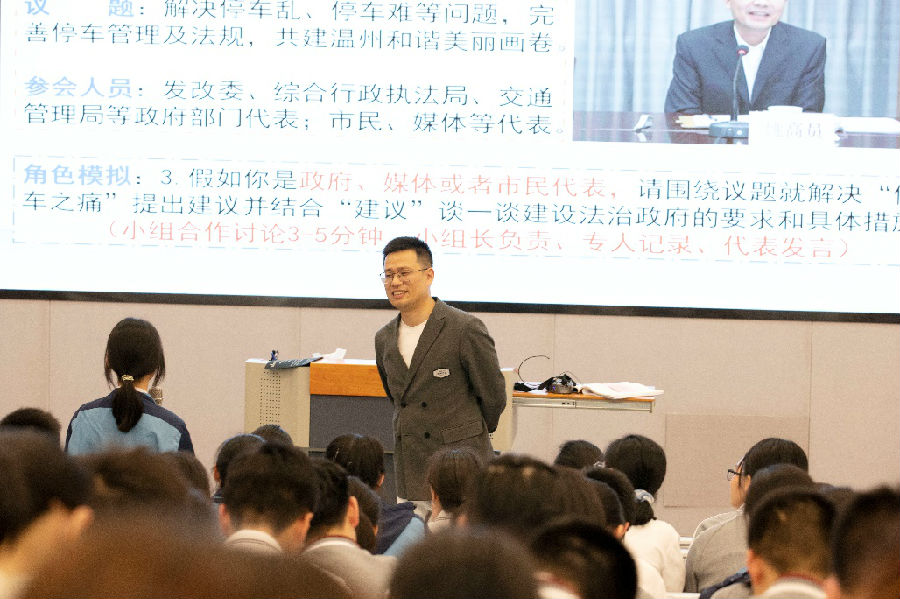 接着,来自瑞安中学的陈瑞森老师与来自温州八高的陈如碧老师对第八课第二框《法治国家》进行同课异构。陈瑞森老师首先对本框题进行破题,自然而然引出了本节课的议题“疫情大考前,政府该如何依法行使权力?”。针对疫情期间政府的表现,设计了三份答卷:差生卷、考生卷与X卷,用巧妙的构思吸引了学生的注意力,别开生面,立意新颖,使学生对法治政府有了更深层次的认识。陈如碧老师以一张罚单引出城市停车难问题,用生活情境引发了学生的热议。通过设置总议题“解决‘停车之痛’话温州‘法治政府’建设”,就如何解决“停车之痛”与学生共同讨论温州的“法治政府建设”,极大地激发了学生的兴趣。通过层层设问,使得学生在独立思考、小组合作等活动形式中领悟了法治政府建设不是一座高不可攀的山峰,既培育了学生对法治政府的政治认同,也切实提高了学生的课堂参与度。