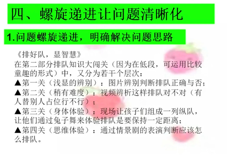 为了让问题有效解决,让学生通过本次本班收获小问题大解决的智慧,曾老师提出了六个解决策略:第一,调查问卷让问题明确化。 第二,体验活动让问题可视化。第三,自制素材让问题情境化;第四,螺旋递进让问题清晰问题方向。第五,提升环节让主题深刻化;第六,后续导航让问题落实化。曾老师带来的问题式主题班会是一次饕餮大餐,也是一次深度的共鸣,老师们这次学习深获启发,提高今后的班级管理和德育教学活动得教学效果。
