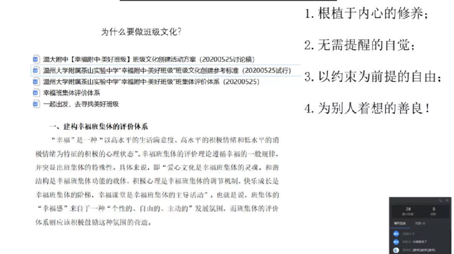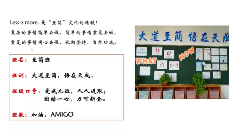 紧接着温州市第十二中学王益琳老师带来了《让班级真正有“文化”》的精彩讲座。王老师分享了9班的班组文化。王老师为班级设立班名:至简班,班训:大道至简,悟在天成。班级口号:爱我九班,人人可取。团结一心,力可断金。班歌:加油,AMIGO.王老师从环境文化、课程育人、活动育人、志愿服务详细阐述如何组班。另外,王老师还分享了2020级崇善12班的组班文化。王老师指出,班级文化形成的有2大标志拥有丰富的文化产品和拥有自己的文化品牌。通过王老师的分享,老师们学习了如何组建班级,创建班级文化,受益匪浅。