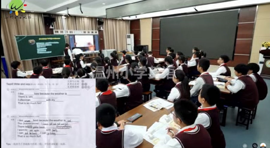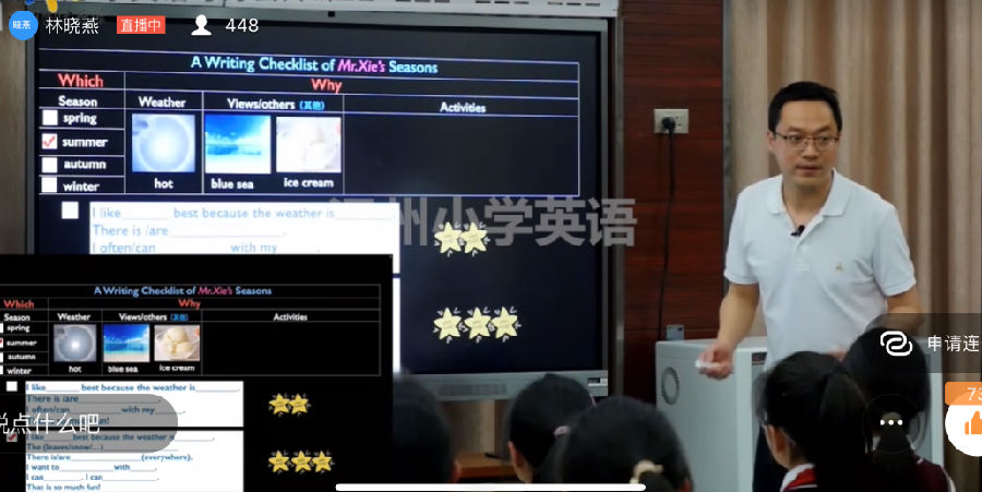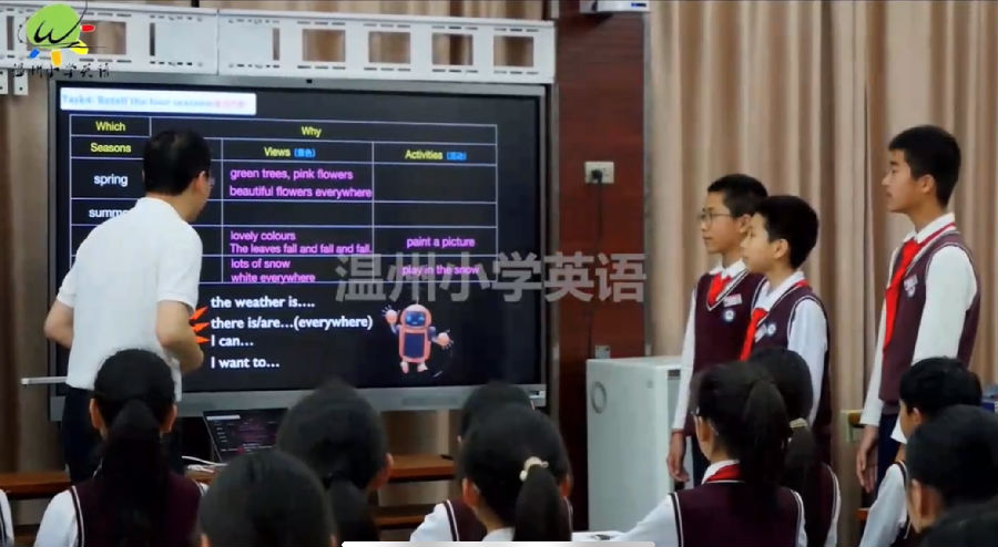 首先,来自瑞安市安阳实验小学的谢卿锋老师带来一堂五年级的读写课《PEP6Unit2 Read and write》。谢卿锋老师深入剖析了本课时核心语言与单元话题My favorite season, 紧紧围绕教材文本,创设了丰富的语用任务,并通过在语言结构上从易到难,在思维层面上由浅入深,依托语篇由整体阅读知文意到局部阅读理细节,最后整体语用输出的教学设计,促进学生在情境中进行有意义的语言交流,最终达成真实的语用输出。