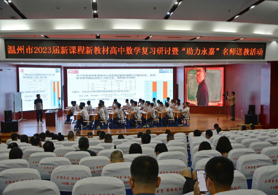 为充分发扬并落实温州市委组织部《全面发挥组织优势助力5个加快发展县跨越式高质量发展十项举措》和温州市教育局《关于助力5个加快发展县跨越式高质量发展“名师送教”集中进点活动的通知》的文件精神,2022年8月31日,温州市名师叶事一老师携名师工作室成员在浙江省永嘉县中学举行温州市2023届新课程新教材高中数学复习研讨暨“助力永嘉”名师送教活动。