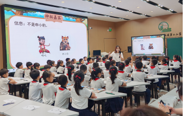 第一节课《简单的推理》由乐清市北白象镇一小的尤婉老师和二年级的学生带来。尤老师以“神秘嘉宾”带领孩子们展开推理,“不是申小豹,就是哪吒”——非A即B模式;接着闯关卡1,运用连线、表格、文字等方式自主探究,先确定哪吒拿的是语文书,敖丙拿的不是数学书就是英语书进行推理——确定C,再非A即B模式;最后闯关卡2,拓宽学生思维,通过填写一个信息,推理出三个人跳绳的个数。学生的思维慢慢经历有序、有理、严密的过程,同时“说理”过程的过程更加具象化。