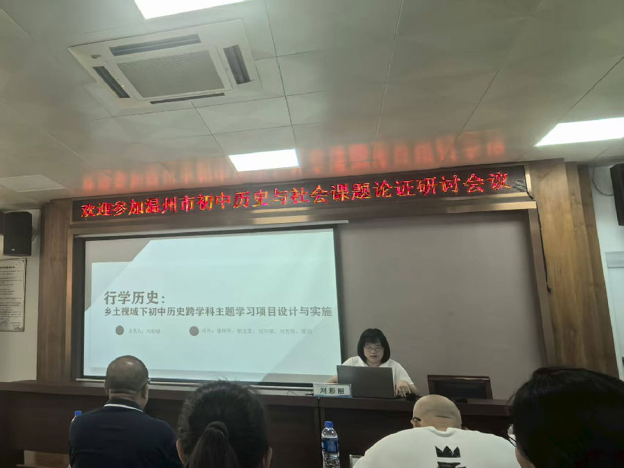 文成县珊溪中学的刘彩丽老师作《行学历史:乡土视域下初中历史跨学科主题学习项目设计与实施》课题分享。刘老师的课题分享旨在通过整合温州本地丰富的乡土空间、文化和社会资源(三域协同),设计以项目为载体、以学生自主探究、合作研究和同伴互学(三学实践)为阶梯的实践活动,让学生在真实场域中体验、思考和领悟历史与社会知识,最终提升核心素养并培养积极的学习态度。