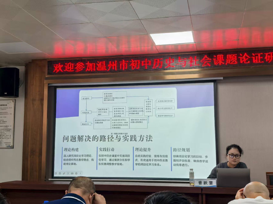 温州市第二十一中学的曾跃慧老师作《链接与变身:历史与社会学科项目式学习常态化教学行动研究》课题分享。课题从“理论构建、实践行动、理论、路径规划”闭环四个方面阐述问题解决的路径与实践方法,以单课→大单元→跨界实现知识深度重构,并依托“ 大单元项目化”整合多维内容,最终推动历史教学从知识传授转向素养生成,突出学生主体性与实践性。