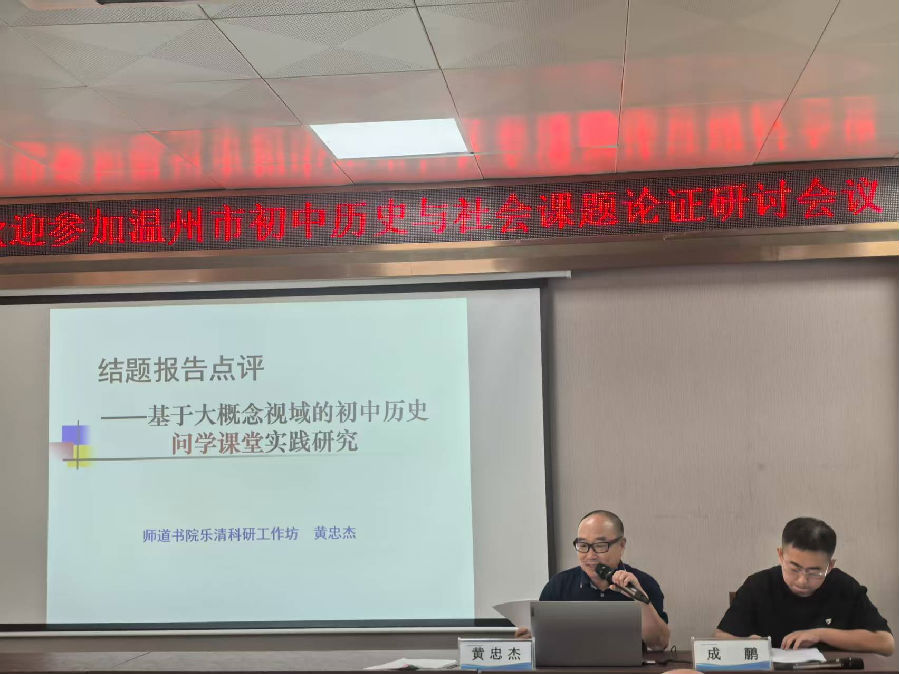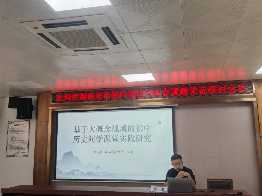 瓯海区第二实验中学成鹏老师带来了《基于大概念的初中历史“问学课堂”实践研究》课题分享,通过史实整合——大概念提炼——课型创新的闭环,构建了以“问学课堂”为核心的初中历史教学模式。展现了三大研究成果:初中历史大概念生成系统与特性提炼、基于史实的学科本位大概念提炼策略、基于大概念“问学课堂”教学模型与课型。以常规课型夯实基础,以项目式/思辨式课型推动深度学习,最终实现师生“教——学”双轨提升。