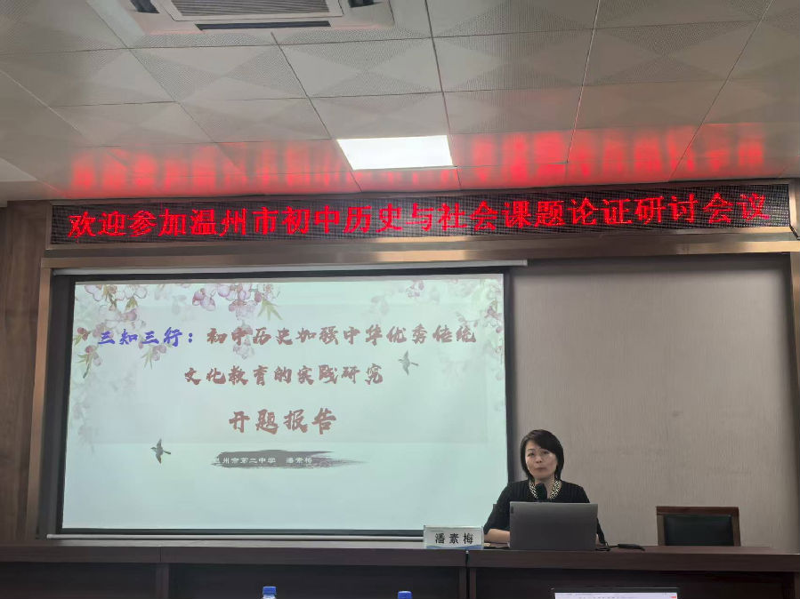 温州市第二中学潘素梅老师作《三知三行:初中历史加强中华优秀传统文化教育的实践研究》课题分享。潘老师指出该课题旨在依托初中历史“中华优秀传统文化”课程内容与在地资源,基于课内“三知”学习策略(感知、探知、悟知)和课外“三行”(力行、共行、传行)来建立指向价值引领的“中华优秀传统文化”课程资源库,最终以期实现优秀传统文化深度学习,培育家国情怀素养,坚定文化自信,促进中华传统文化的有效传承与传播。