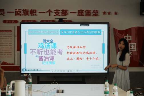 首先,瑞安中学附属初级中学的施德峰老师作《破壁·贯通·共生:高质量发展背景下大中小学思政课一体化长效机制学校实践研究》课题分享,从管理角度探究学校思政课堂发展的潜能、路径与效果。施老师从“‘破壁’机制:构建跨学段协同新格局”到“‘贯通’路径:打造一体化教学新体系”到“‘共生’生态:健全多元协同育人网络”三个方面,具体阐述了他对思政课堂的设想与愿景。